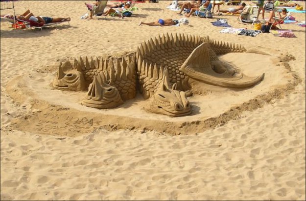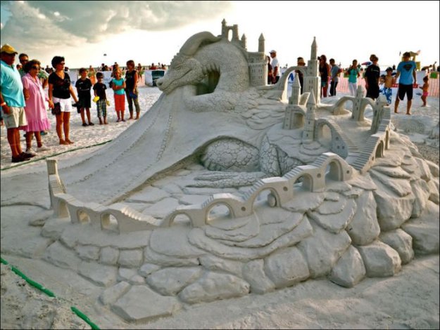 Это не песок в общепринятом понимании, в песок добавляется специальный клей и цемент, масса получается эластичнее песка и держит как слабый раствор бетона, получается довольно надежно, хотя это не монолит, скульптуры все-равно хрупкие, но дождь им не страшен ;)